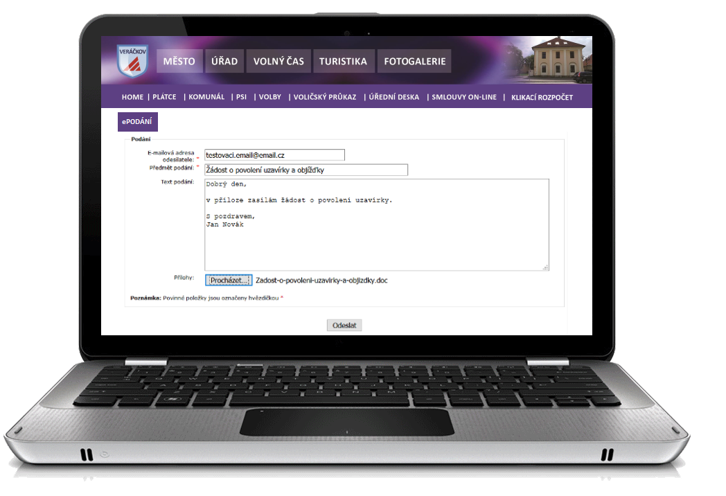 Díky ePodání však může formulář podat kdykoliv a odkudkoliv. Vrátí se na stránky města a v části, kde je umístěno ePodání, vyplní svou e-mailovou adresu, předmět, text podání a může připojit přílohy (vyplněné formuláře). Každý, kdo je zvyklý pracovat s e-mailem, se velmi rychle zorientuje. Podání je možné učinit, aniž by byl občan přihlášený. Je tedy intuitivní a snadno dostupné.