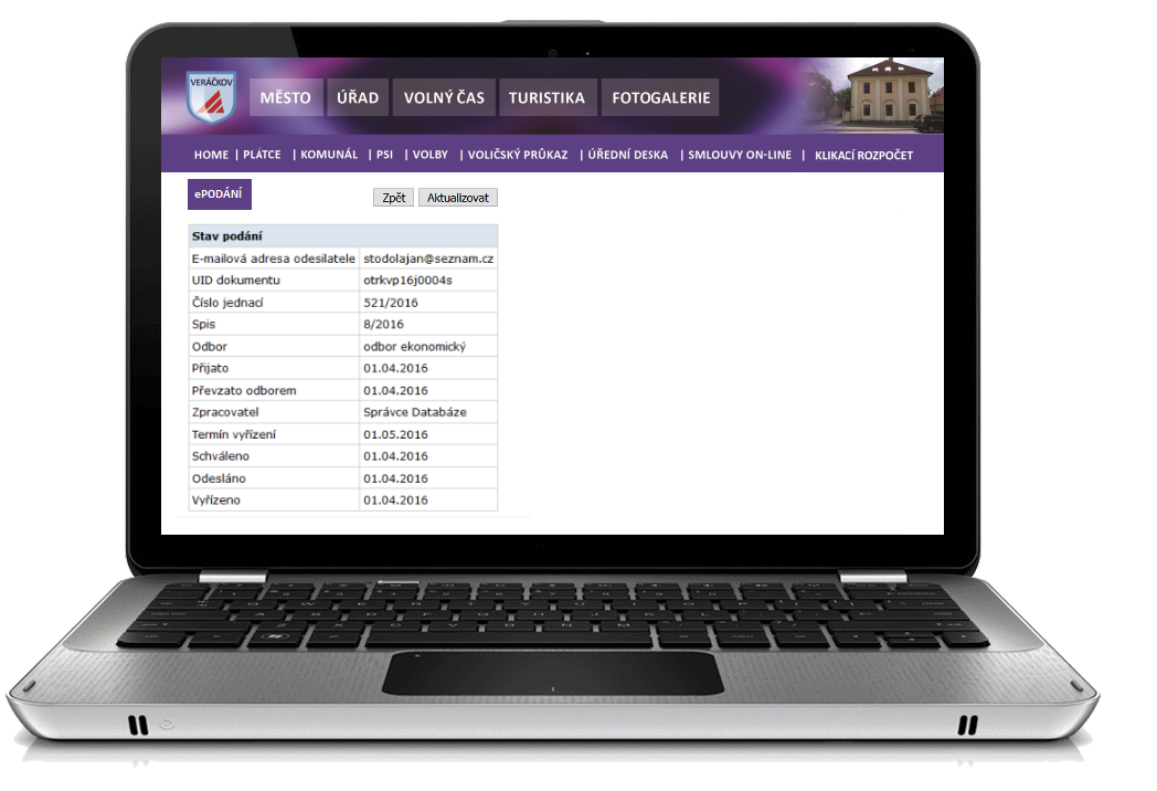 Aby zjistil, v jakém stavu se podání nachází, nemusí volat ani chodit na úřad. Na stránkách města zadá svůj e-mail a UID a vše se ihned dozví: kdo jeho případ zpracovává (jméno a příjmení, e-mail, telefon) a v jakém stavu se jeho podání nachází (datum přijetí, schválení, odeslání či vyřízení).